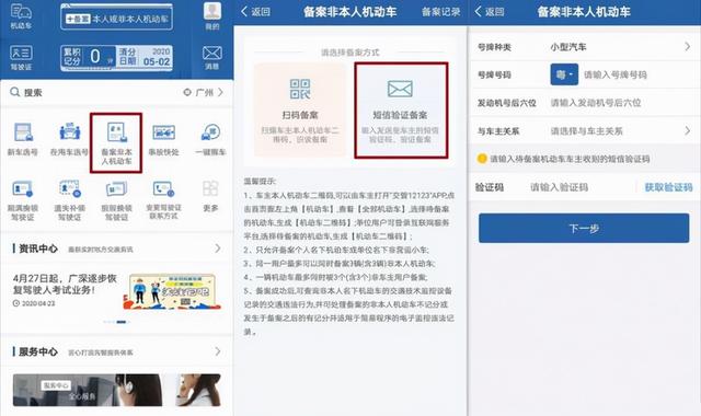 下载注册流量管理12123 APP(参考手机环境:IPHONE 12,IOS14,软件:12123版本号:V2.7.1)。登录后,进入首页。可以根据下面最左图找到已登记的非个人机动车,点击进入中图所示页面。此时需要车主提供短信验证码才能继续操作。完成后,可以进入最右边的界面,填写车牌号、发动机号等信息,然后输入验证码,再进行下一步,直到提交。