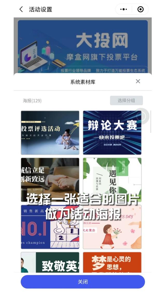 我们先设置活动海报,点击海报位置,在弹出的界面中选择素材库。素材库里有很多图片资料。选择一张合适的图片作为活动海报。当然,你也可以选择自己设计活动海报。