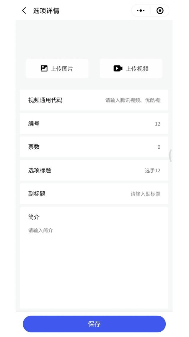 好了,我们学会了删除玩家和添加新玩家。接下来,让我们上传球员的信息。首先,点击任意玩家进入详情页面。玩家详情页面默认的内容有:图片、视频、人数、票数、标题、副标题、简介...需要注意的是,这些内容是可选的,但不是必需的。上传图片要求5M以下,推荐尺寸800*800像素,视频要求50M以下。