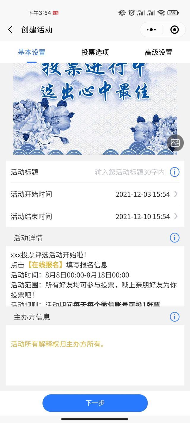 第3步:创建模板后。在基础设置部分,自定义标题和时间,主办方信息可以填也可以不填,最好填,这样别人参加你的活动会觉得更靠谱。