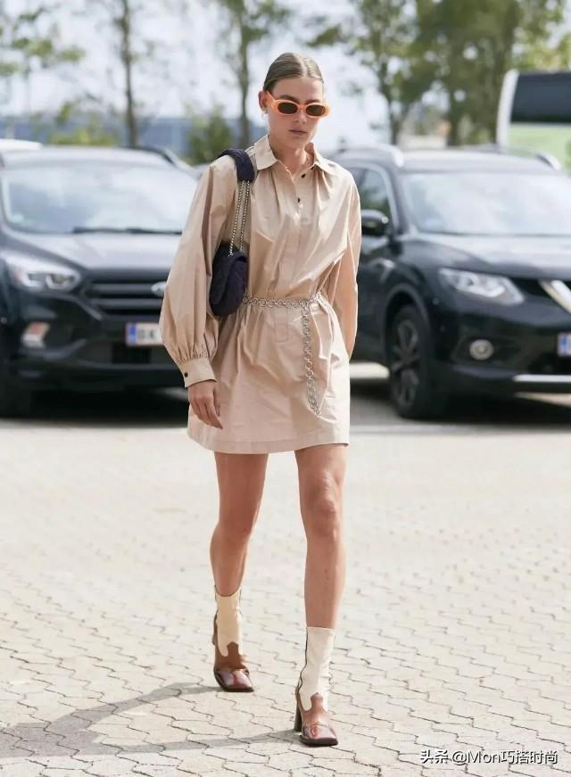 春夏的短靴方头鞋搭配短底让腿更好看~衬衫裙一定要选择有一定硬度的面料,这样穿起来会更有型。