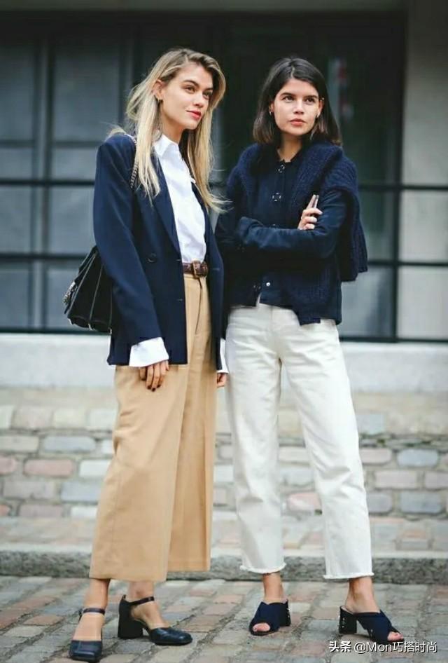 这种鞋非常百搭,休闲又不失时尚感,搭配能露出脚踝的九分裤和阔腿裤都有自己的feel。穿拖鞋式方头鞋时,最好选择轻松感强的单品,选择有下垂感的轻薄面料。