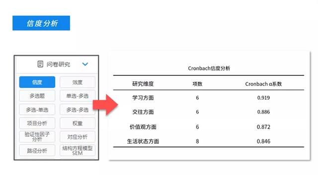 首先,Cronbachα系数可以通过SPSSAU【问卷研究】-【信度】计算出来,用来衡量问题之间的内在一致性。