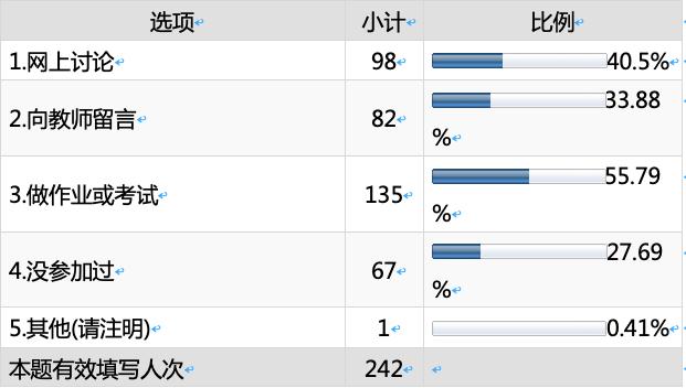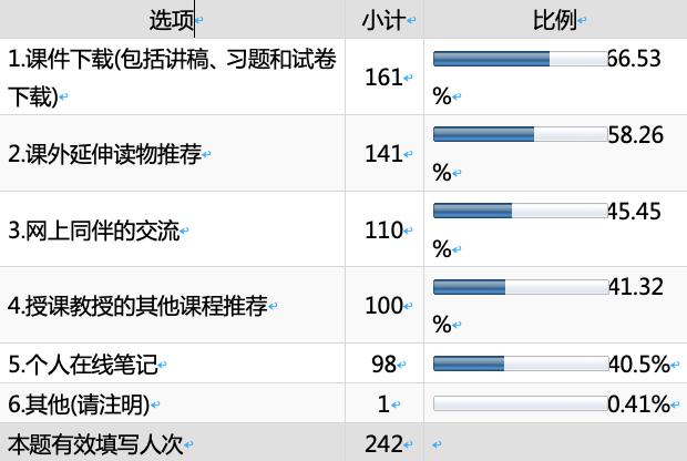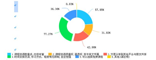 总结:大部分学生对网络课程的认识是积极的,认为它方便自由,时间地点安排灵活。也用过网络课程。网络课程接受度很高。但也有一定的要求,比如希望缩短时间,增加讨论环节,用户在审核资源的同时希望分享更多的资源。从学生的使用习惯来看,用好网络课程有两个要求。一是老师幽默风趣,同时要求学生有自制力,克制注意力。一方面是学生学得不好,所以网络课程利用率低。另一部分学生希望减少或直接取消网络课程考试。这可能与中外网络课程的差异有关,因为国外网络课程有毕业证书,而中国网络课程则相反。
