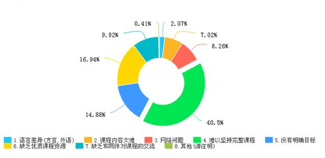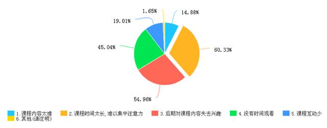 从图2和图3可以看出,60%的学生因为时间太长无法集中注意力而放弃了一门网络课程。然而,大学生学习网络课程最大的困难是坚持的困难和课堂效果的困难。这与网络课程难以监管的机制有关。和学生的自制力也有很大关系。在这种背景下,再加上学生可以自由选择网络课程,对网络课程的要求自然就提高了。而且如果不是学校的强制任务,学生放弃一门网络课程的成本是很低的。如果学生的学习兴趣不够浓厚,当然很难有效利用网络课程。