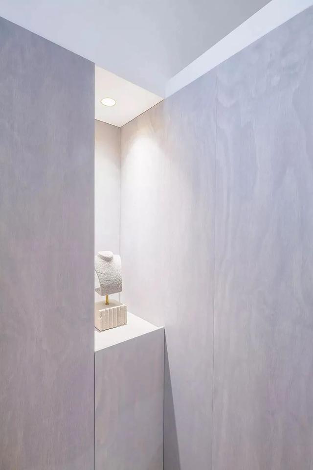 Supervoid设计事务所用白色穿孔板在立面画出柔和的云状,引人注目,优雅地展示了珠宝。室内混合了各种材料,黄铜,石膏,木材...空虽小,却给人丰富的视觉体验。