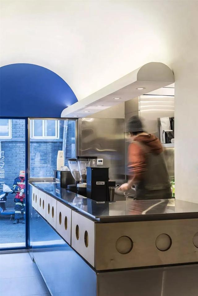 由于面积有限,咖啡店只满足制作咖啡和基本的收纳功能。设计师参考了欧洲街头“站着喝咖啡”的文化,设置了可靠的木质迷你吧台,贴心的按下包钩,巧妙的解决了咖啡店无座区的弊端。