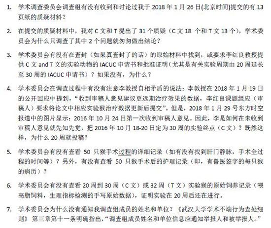 霍文哲终于在1月26日7点提交了所有的问题。强调要求武汉大学封存8篇文章的实验原始记录,避免记录被篡改及相关文件被事后补充,并要求李洪亮在被质疑后立即回复(72小时内)。这8篇文章是李洪亮团队在2016年6月之后发表的(5篇《自然医学》,1篇《自然通讯》,1篇《循环》,1篇《高血压》)。霍文哲认为这八条在猴子实验中是密切相关和连续的。