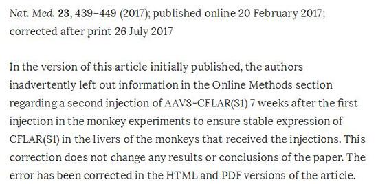 2017年10月6日,《自然-医学》发表了更正声明。这一次,与李洪亮团队涉嫌学术造假事件相关的猴子实验有关。在C于2017年2月20日发表的原创文章中,李洪亮团队并未在实验方法中描述“2016年5月6日对50只食蟹猴进行外周静脉注射实验”这一步骤。更正声明称,“在最初发表的论文中,作者不小心遗漏了7周猴子实验后第二次注射AAV8-CFLAR(S1)的信息”。