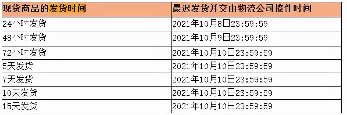 买家在2021年10月1日00: 00: 00至2021年10月7日23:59:59期间支付的订单,如未按要求发货,且交易履行过程中买卖双方发生交易纠纷的,自2021年10月8日00:00:00起恢复(包括但不限于24小时/48小时/72小时/5天/7天/10天/现货商品商家)
