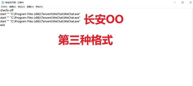 第三个:和第二个差不多,但是这个可以精确控制你想要的数量。打开记事本,前面输入@ecfo off(注意中间有空框),后面输入exit。(这里记住一个在顶一个在底,后续所有操作都在这两个操作中间,详见下图)1。首先查看自己的微信保存路径(右键-属性-快捷方式-目标,复制以下字母,使用双引号)。2.将刚刚复制的东西粘贴到记事本中,不要删除双引号。3.+start+空方块在粘贴的英文字母+空方块前面,(记住这里的空方块)。4.这时候就说明你打开一看,是一个微信。如果要两个,就把这个字符串复制粘贴到新的一行(@ecfo off和exit不需要复制,新的一行已经在这两行中间了)。如果要三条微信,再贴一行,以此类推。5.单击文件-单击另存为-桌面。此时文件名为“微信Duokai.bat”,类型均为格式。回到桌面,不要点开原来的微信,点开这个新的就可以了。