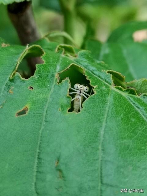 这只豆娘从叶子的洞里伸出头来,看起来好像是从窗户向外看。