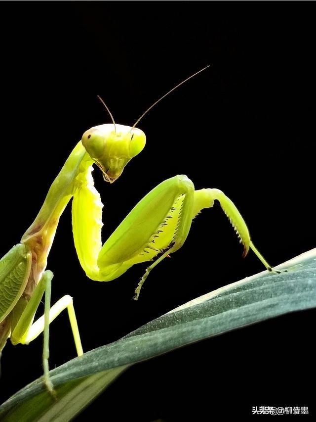 这种深黑色的背景与螳螂的祖母绿形成鲜明的色彩对比。