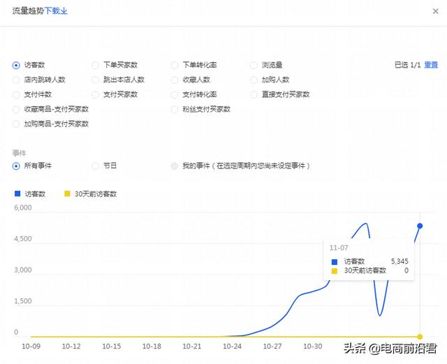 在这个图的数据中,我们可以清楚的看到,在活动期间,除了1号开始开门红的那一天,2号的流量开始直线下降,5号达到最低值,6号受第二波活动预售的影响,流量开始逐渐攀升。从这里我们不难发现,活动时段的节奏对市场流量的影响很大,尤其是在第一波和第二波活动中,前期流量会有所下降,但在活动当天爆发,除了活动当天,活动结束后的流量都会受到不同程度的影响,所以这里可以解决大部分商家的疑惑,这几天流量下降这么厉害的原因,市场上的每一个商家都会受到不同程度的影响。
