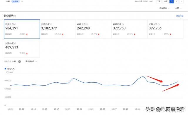 从数据中我们不难看出,1日访客量达到峰值,可见双11对于女鞋商家来说是一个非常重要的活动节点。这意味着在明年的规划中,我们的店铺要增加一个双11前的活动预热,多做购物,一是增加产品的知名度,二是促进购物的转化率。
