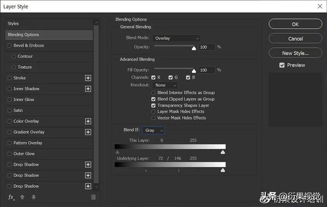 Multiply4接下来,我们将带回一些亮点,以防止图像看起来过于平坦。创建一个“曲线”层,并将顶部锚点移动到左侧大约四分之一的位置。调整曲线的If混合设置,使其仅影响对象的最亮点。切换时请记得按住Alt键拆分“混合”!一旦我们很高兴,我们可以组,我们刚刚创建了四个调整层,并命名为“主题颜色水平组。”