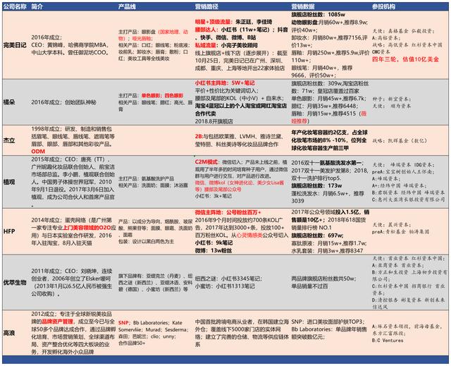 彩妆线的典型标杆是完美日记和橙花。完美日记从唇釉、眼影盘开始,目前基本涵盖了粉底、眼线等全线妆容。营销渠道覆盖明星、顶级流量和大量腰部KOL。小红书笔记达到11w,是一个成功的上升案例。从创始年就一直稳坐国内彩妆线top1,四年三轮融资估值达到10亿美元。橙花可以说是一个小而美的案例。流量铺设强度没有完美日记高,切入点更接地气。市场是单色眼影吹起来的,抓住了低价和高成新率这两个脉冲门。眼影数量在100个以上,单个价格在30左右。除了旗舰店,在销售端也铺设了大量的皇冠店,很难准确估计其销量。有趣的是,创始团队依然神秘。目前,从市场来看,国内彩妆的口碑在不断增加,还有其他像李曼、姿诗、玛丽黛佳、智友泉等。,既是新品牌也是老品牌。