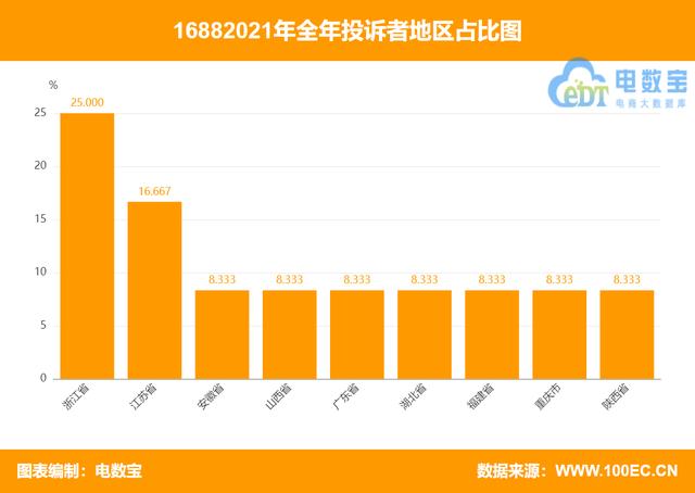 网络经济学会“电子商务”电商数据库显示,2021年,投诉“1688”的用户主要集中在浙江、江苏、安徽、山西、广东、湖北、福建等省份。