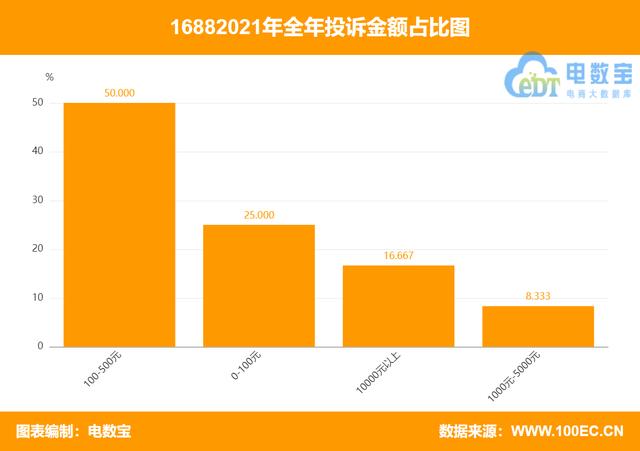 “点读宝”电商数据库显示,用户投诉的“1688”消费金额以100-500元以上、0-100元、10000元、1000-5000元为主,占比分别为50%、25%、16.667%、8.333%。