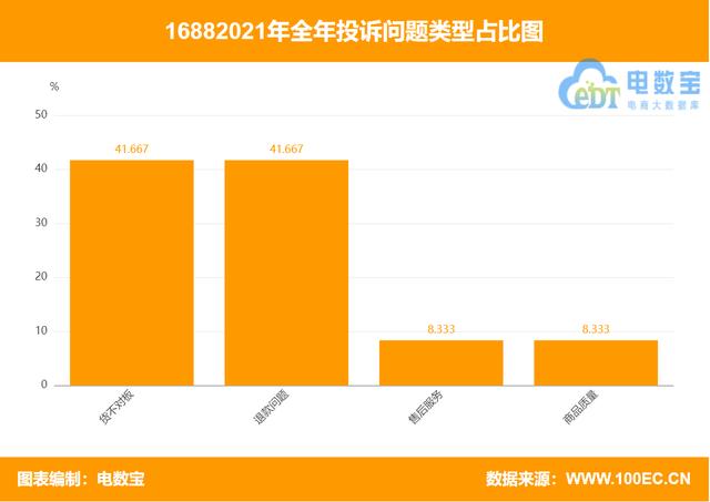 据网络经济社“点读宝”电商数据库(DATA.100EC.CN)显示,“1688”主要存在退款问题、发错货、售后服务等问题。