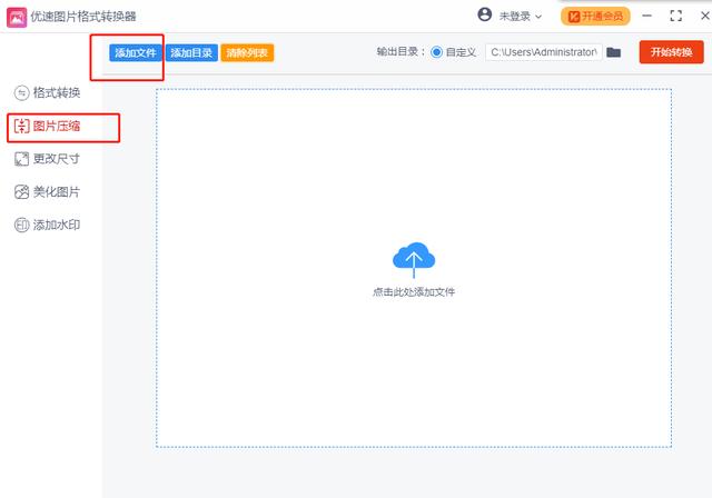 第一步:打开软件,点击左上方蓝色的【添加文件】按钮,批量导入需要压缩的图片,在左侧功能中选择【压缩图片】。