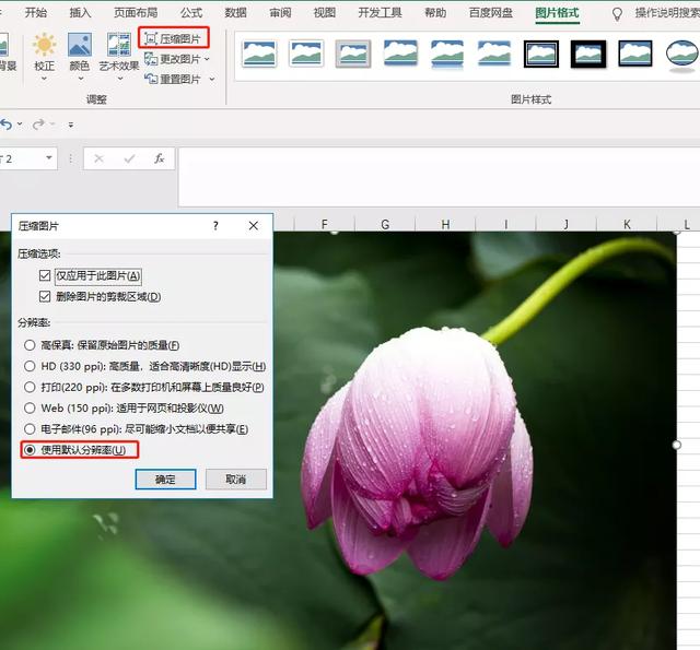 压缩方式:将图片插入Excel,然后选中图片,在[格式]选项下-点击[压缩图片]-选择[使用默认分辨率],点击[确定]