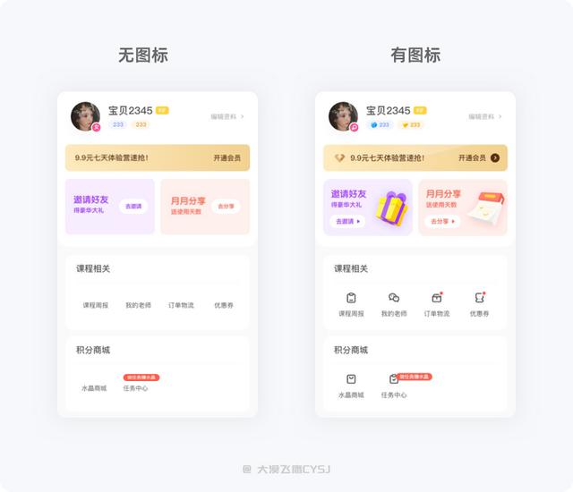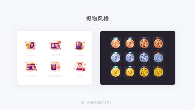由于拟物化图标的信息元素复杂度高,视觉效果突出,在页面中频繁出现会干扰其他信息的存在,这在游戏应用中很常见(但不会太详细)。在其他类型的应用中,大多出现在营销类型的界面,如话题页面、成果列表、会员中心等。