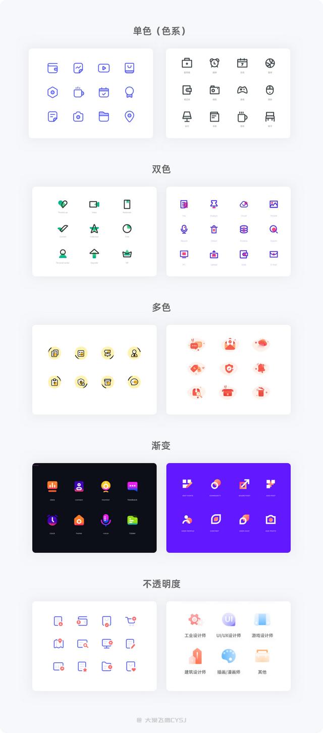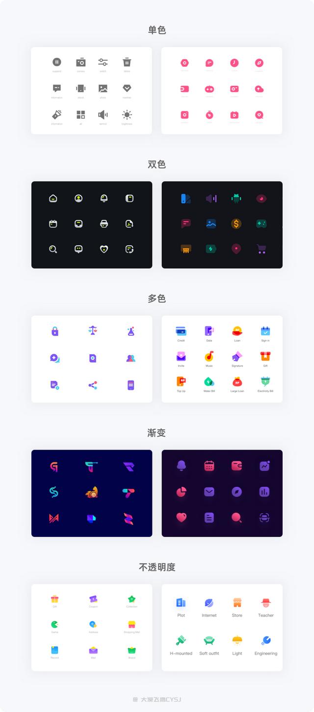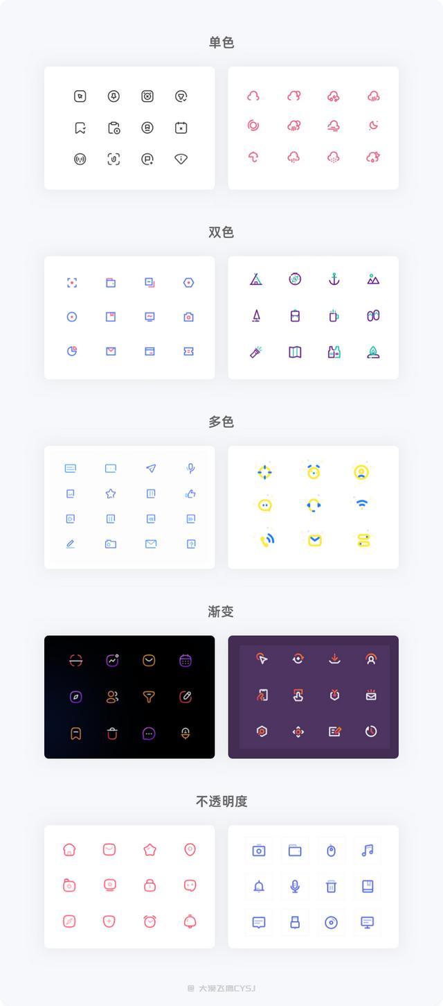 ⑤不透明度:调整图标中某个元素的不透明度,可以在不改变色系的情况下,丰富配色的细节,可以更细腻地与背景色融合,从而解决多色渐变视觉跳跃的问题。
