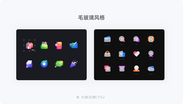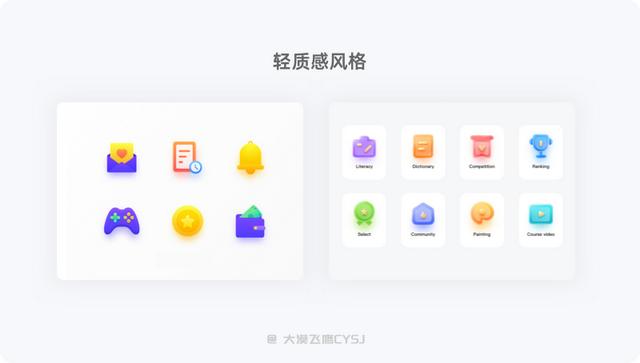 与准物化图标相比,光纹理不会有太多复杂的元素,主要通过颜色渐变、灯光、投影等各种图层样式。,呈现出非常柔和的立体感,整体风格比较年轻化,给人一种轻盈、简洁、精致的感觉。