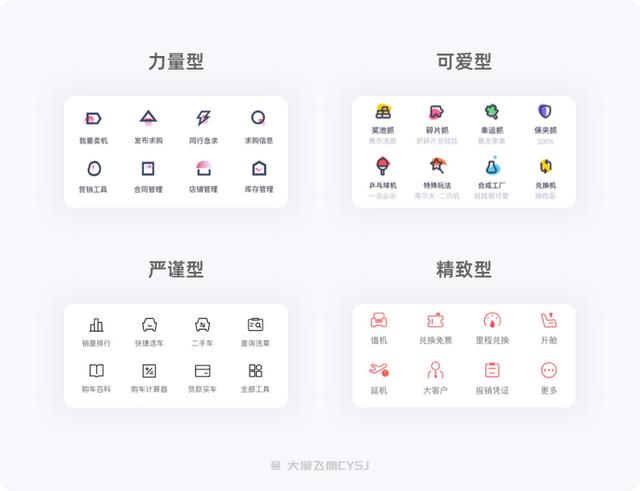 根据产品属性、目标用户和应用场景,找到最适合自己产品个性气质的图标设计风格,比如健身应用属于力量型,粗矿型,圆角和曲线适合女性产品等。,这些在之前的《性格与气质》中都有举例说明。