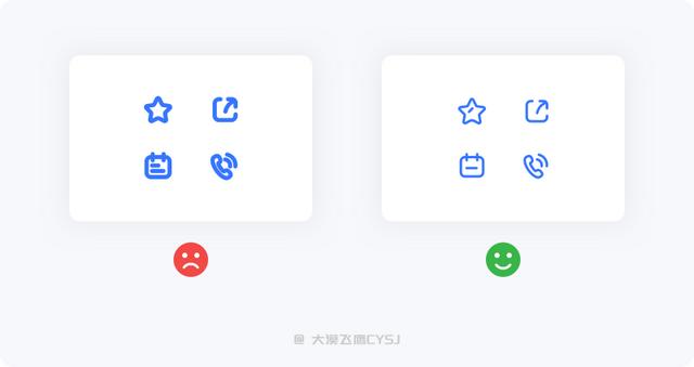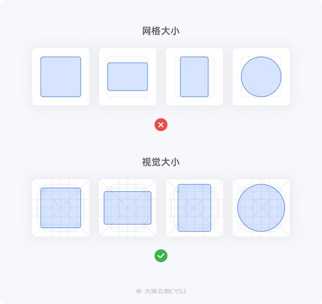 从上图可以看出,同样大小的图标在真实视觉中差别很大,就像一个有100个像素的圆。与100个像素的正方形相比,从逻辑上看,大小是一样的,但从视觉上看,正方形肯定更大。所以我们常说图标一样大,不是真实大小,是视觉感受。