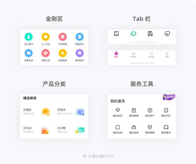不同位置的图标在界面中有不同的功能、风格和设计思路,比如金刚区、分类、标签栏、服务工具等等。