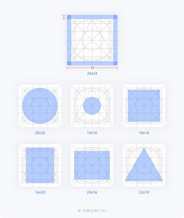 为了保持图标视觉上的一致性和平衡性,需要画出关键线来指导和规范图标设计。关键线由圆形、方形、横矩形、竖矩形、三角形和对角线组成。网格的大小需要保持在4的倍数,这样不同大小的图标都可以轻松适配。可以以24*24px的网格尺寸为基准,通过增加倍数来类比其他尺寸的图标,比如48*48px,72*72px……...