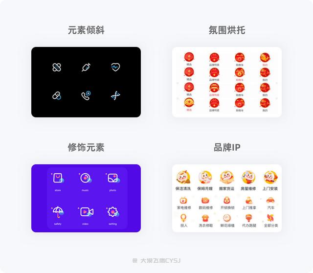 根据行业类型和风格,进行创意设计,如线性统一断点、品牌基因、单一元素倾斜、节日氛围、装饰元素等。,是塑造图标灵魂或传达更多信息的二次创作。