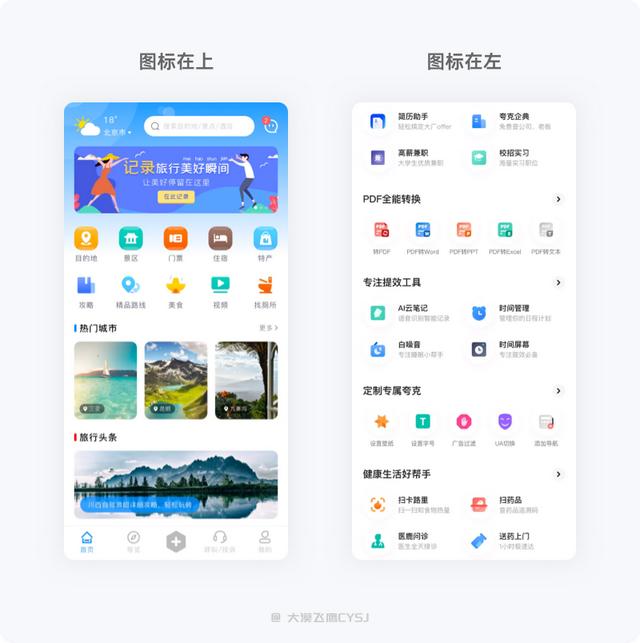 好的图标不仅容易识别,效率更高,还能让界面更简洁。所以我们常见的图文界面大多是图标在上,文字在下,或者图标在左,文字在右。这些设计足以说明图标的视觉传达优先级高于文字。