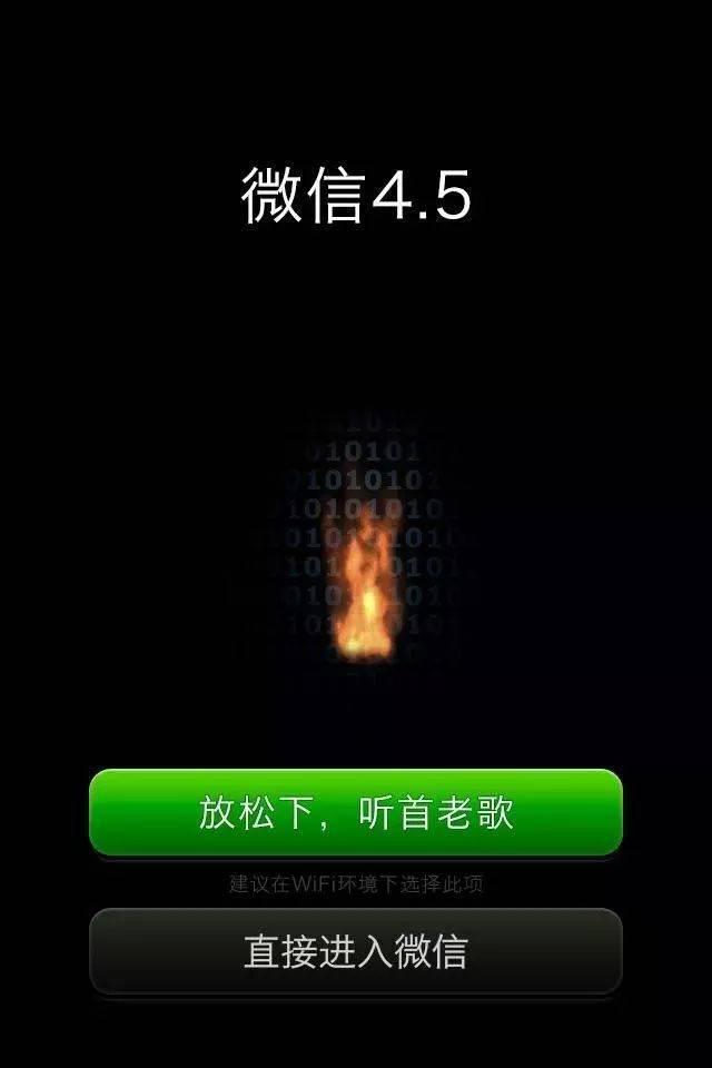 2013年2月5日,微信4.5版本发布,启动页面底部地图是一个只有0和1的黑暗世界,被一团动态的火焰点燃。页面中下部有两个选项,一个是“直接去微信”,一个是“听一首老歌”,崔健的没事。