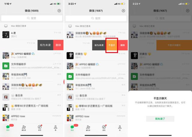在微信页面中选择想要隐藏的聊天会话,向左滑动添加“不显示”操作。点击后,会话将从主页中隐藏,但聊天记录不会被删除,有新消息时会再次显示。