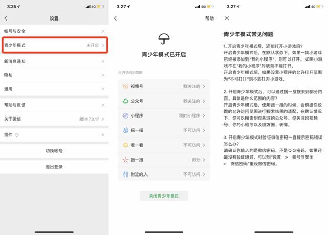 开启“青春模式”后,摇一摇、看看、附近的人等微信相关功能将无法访问。微信游戏、小程序、视频号、微信官方账号、搜索、搜索等功能也会受到保护限制,家长可以根据情况设置允许访问范围。