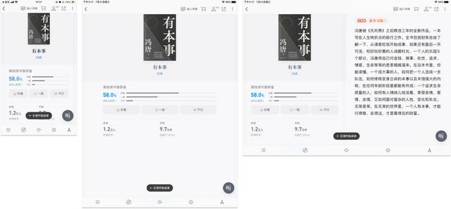 当然,并不是所有的app都采用单一模式。比如微信阅读,在其他页面上是按照竖屏宽度显示的。但说到看书界面,就是充分利用iPad大屏,把内容显示在左右两栏。