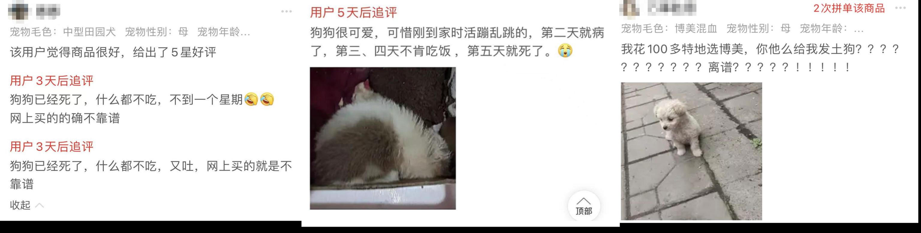 在产品的评论中,有买家声称产品不对,“我花了100多多特选了博美,却得到了一只土狗?”根据更多买家的照片,狗狗的健康状况堪忧。“这只狗很可爱,但是很遗憾,当它回到家的时候,它还活蹦乱跳的。第二天就病倒了,第三天第四天不吃饭,第五天就死了。”“他不到一周就走了,还有小病毒,建议不要买。”