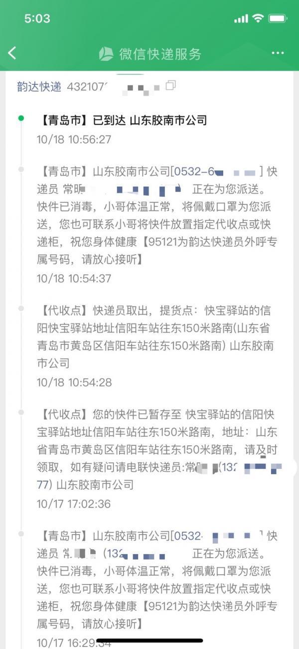 10月17日下午,刘女士收到调度通知。“当晚我打电话回家问衣服合适不合适,老人告诉我没收到快递。”刘女士再次查询物流信息,发现包裹已送达黄岛区新宝堡站。她告诉辛。com说正确的收货地址应该是城阳区,不知道哪里出了问题。