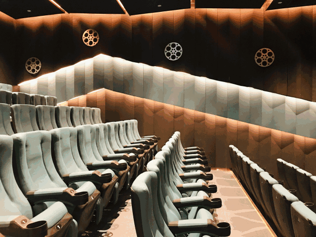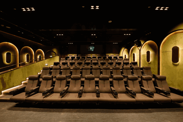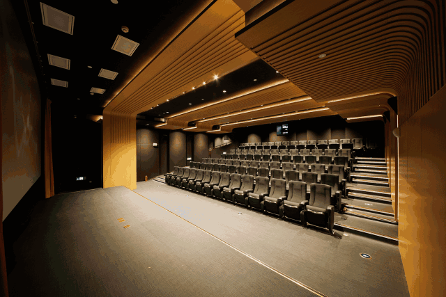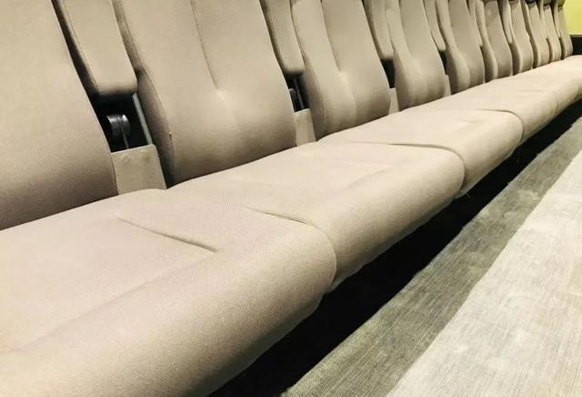 灰色的座位和木色的装饰相配,透出简洁剧院风。宽敞的空间里只放置了97个座位就是为了让大家坐得更加宽松。