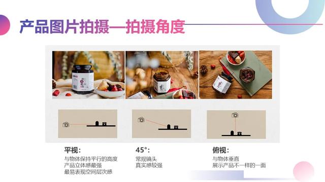 拍摄角度决定了产品在用户眼前的感官状态。这里推荐三个角度: