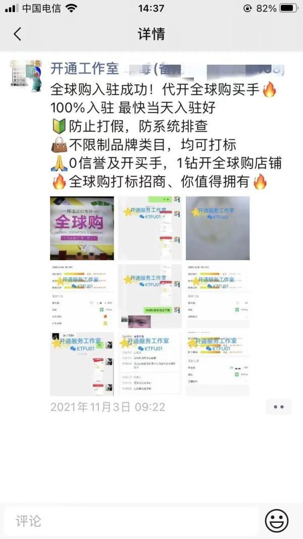 11月1日,论文在淘宝找到其中一家商家,花了350元,只提供了网店的账号密码信息,两天后收到淘宝官方发来的全球购成功的信息。此外,商家还表示可以提供海外代理签到等一站式服务。
