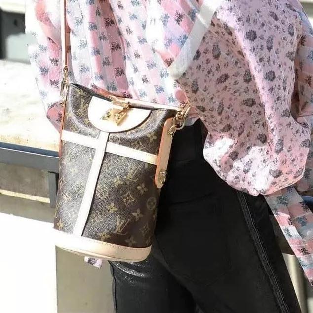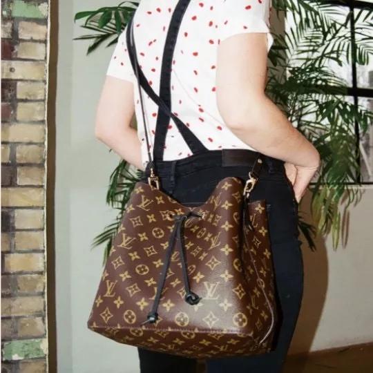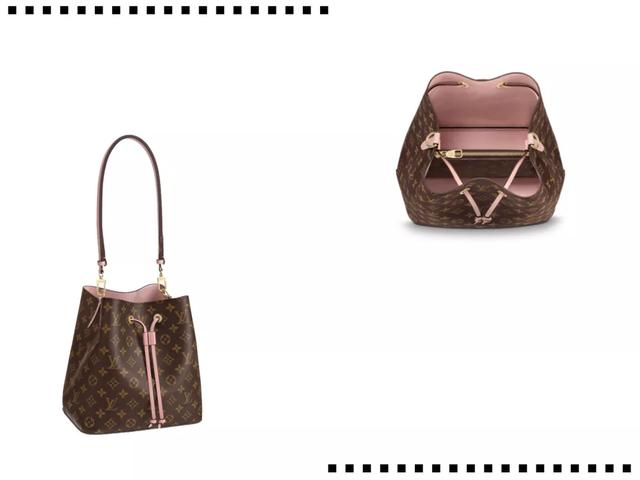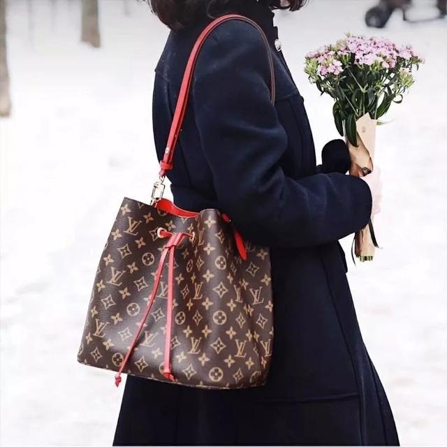 LV水桶包的款式很多,但目前最流行的是不张扬的Néonoé复古手袋。表面是老花镜帆布,里面是纯色麂皮,肩带和包前面的抽绳是皮质的,很有质感。