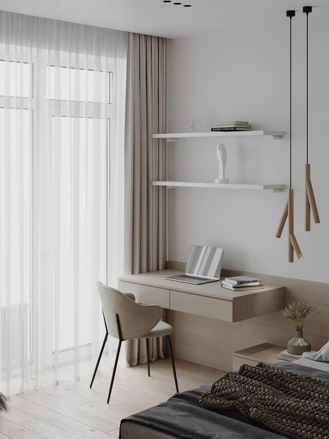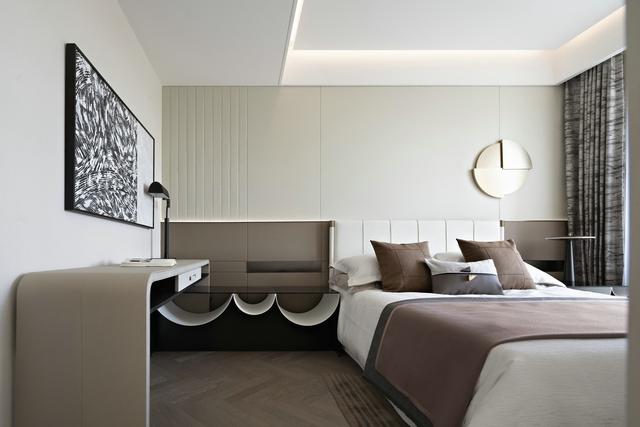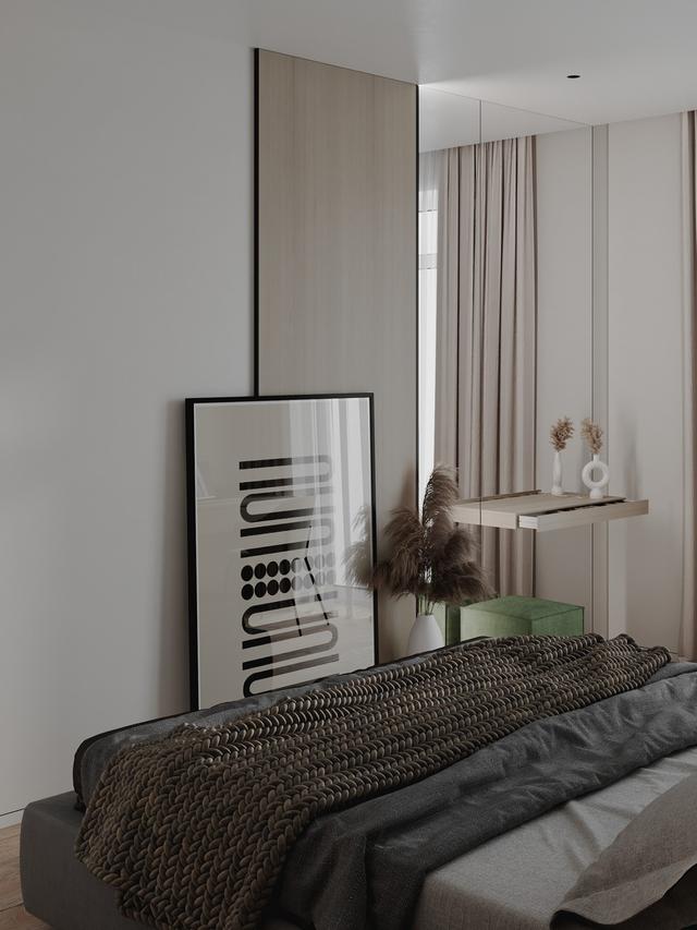 如果床边衣柜的门不受家具影响或者衣柜在床尾,床头柜可以延伸出来当梳妆台用。根据实际卧室大小空,1m的桌面长度足够了。