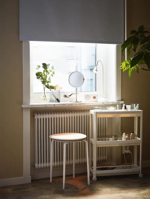 窗台延伸15cm左右,窗边放个化妆镜,窗台也可以变身梳妆台。配备多层手推车,每层设置高沿,避免化妆品瓶瓶罐罐掉落的风险。