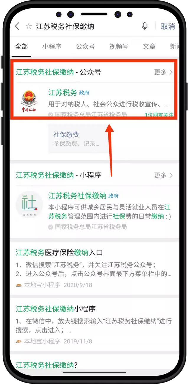 此外,还可以直接搜索关注地税局(或社保局)公众号进行缴费。