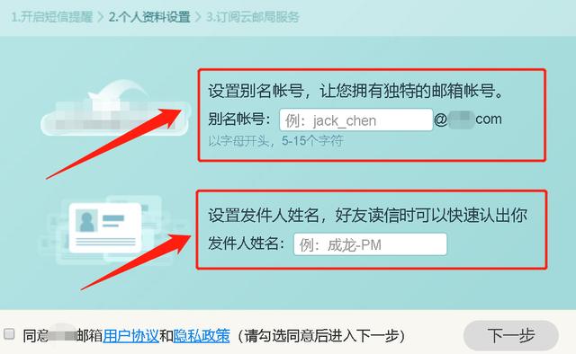 首次使用手机号登录手机邮箱时,会弹出提示,要求用户设置邮箱的别名账号和发件人姓名,可根据用户的使用习惯填写。完成后,勾选用户协议和隐私政策选项,点击下一步,即可进入邮箱。如下图: