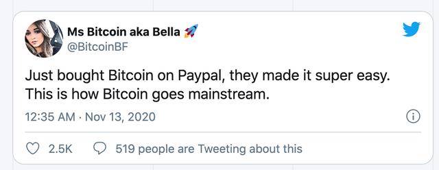 “我刚刚在Paypal上买了比特币,操作超级简单。比特币将通过这种方式成为主流。一个化名BitcoinBF的推特用户说。
